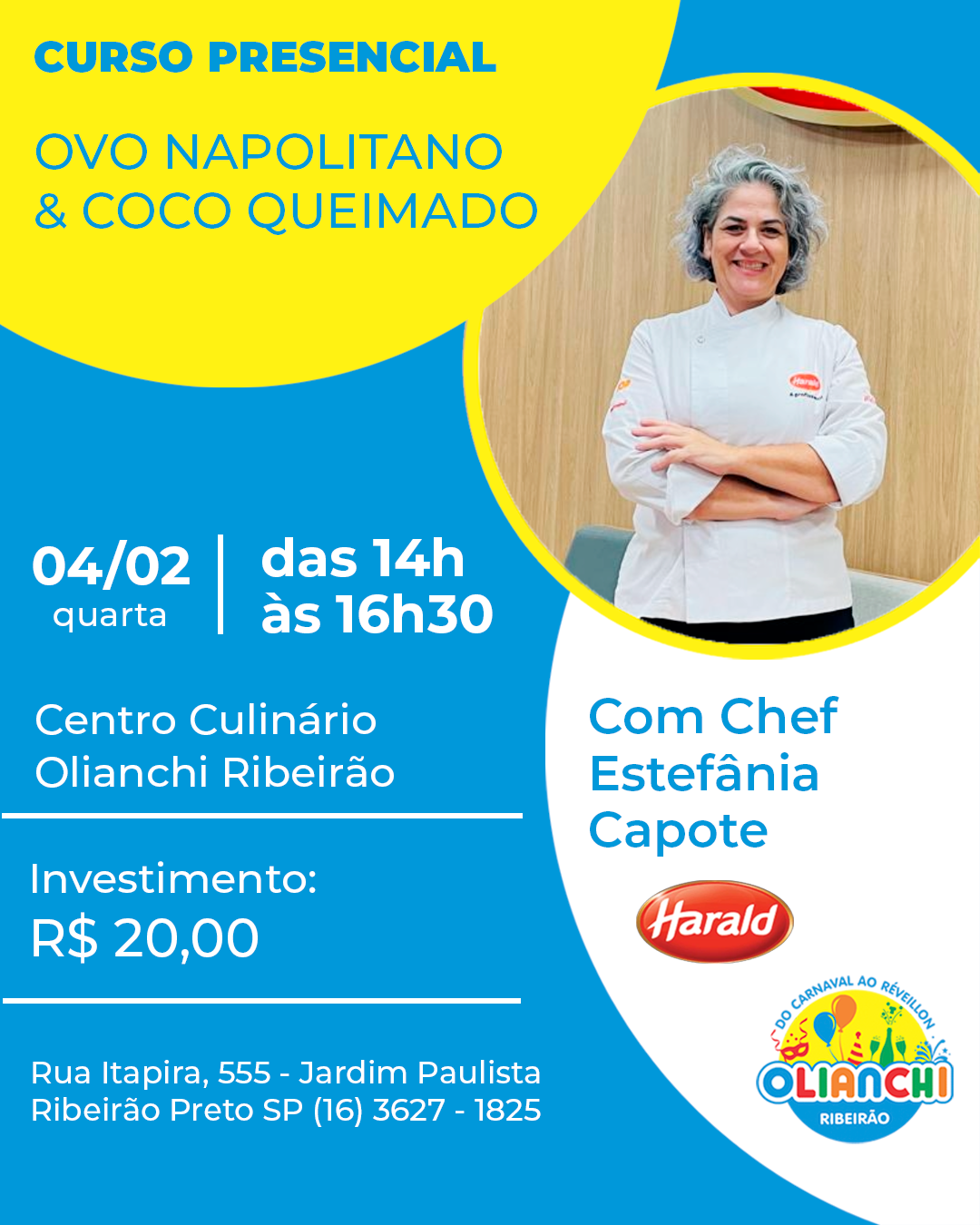 O curso será realizado no dia 04 de fevereiro às 14h, no Centro Culinário da Olianchi Ribeirão, em parceria com a Harald e a Chef Estefânia Capote, com foco em técnicas, sabores e aplicações práticas para vendas.